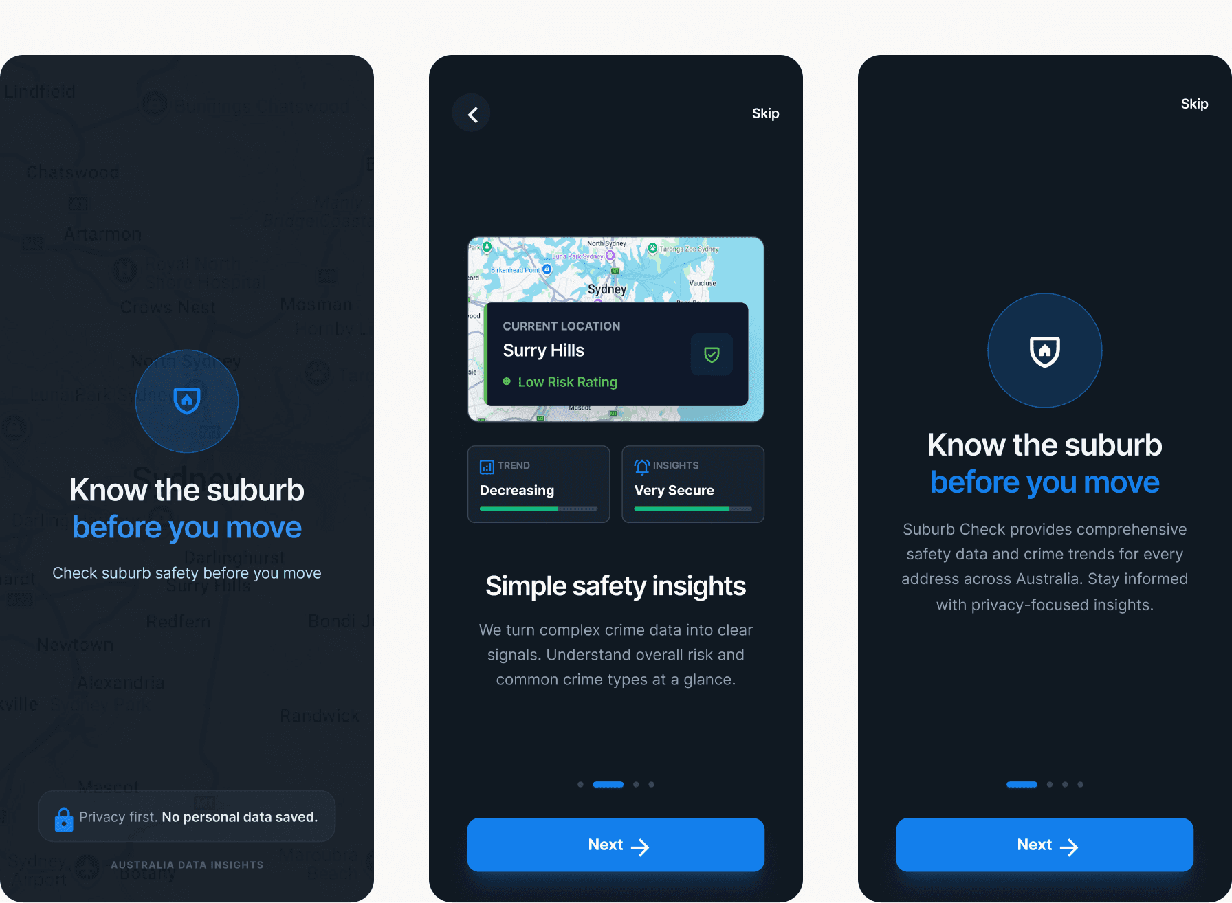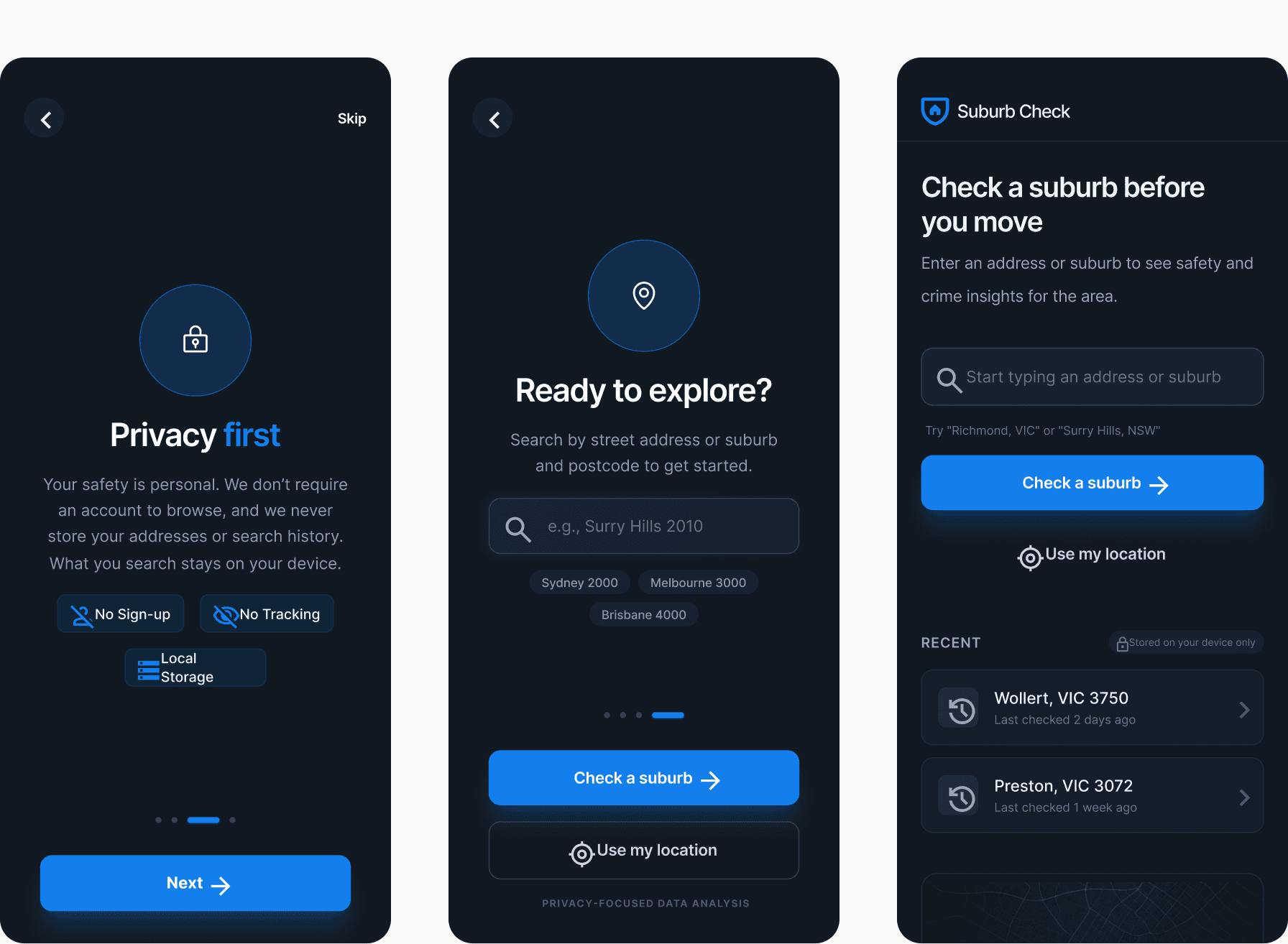 Please note that the "Suburb check" project described below is an app concept developed for design demonstration purposes. All safety figures, crime statistics, and location details used in the mockups are sample data intended as placeholders. This information is not an accurate representation of real-world crime metrics and should not be used to make actual property or relocation decisions.