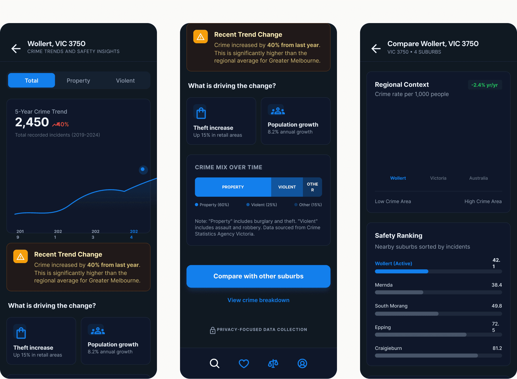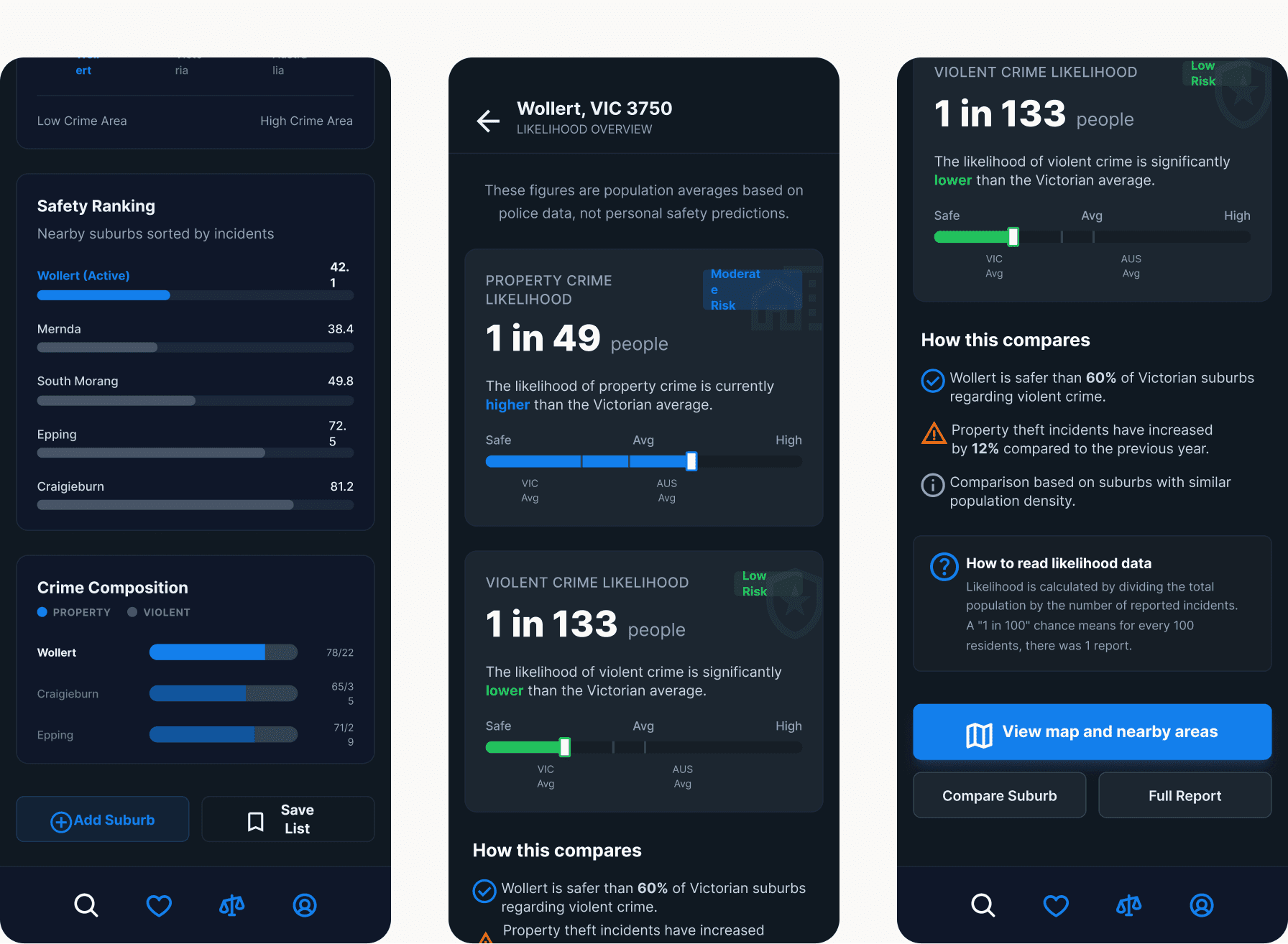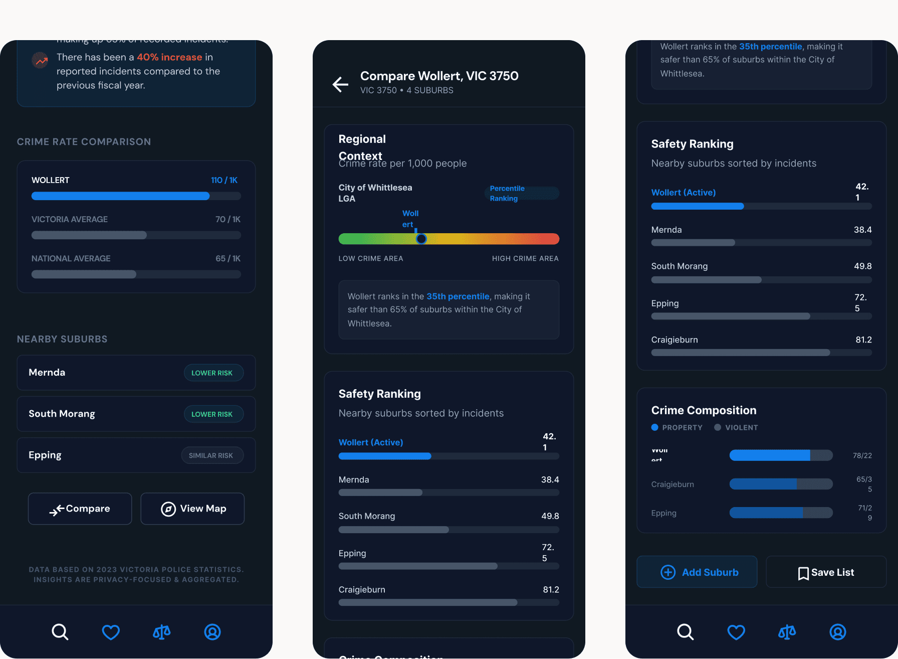 Choosing a suburb is often about trade-offs. We designed a "Compare" tool that allows users to benchmark a suburb like Wollert against state averages or neighbouring areas. This visual benchmarking is essential for a better user experience because it provides the necessary context for the data. Seeing that a suburb's crime rate is "High" compared to the state average, but "Lower" than a nearby alternative, helps the user make a more nuanced and less fearful decision.