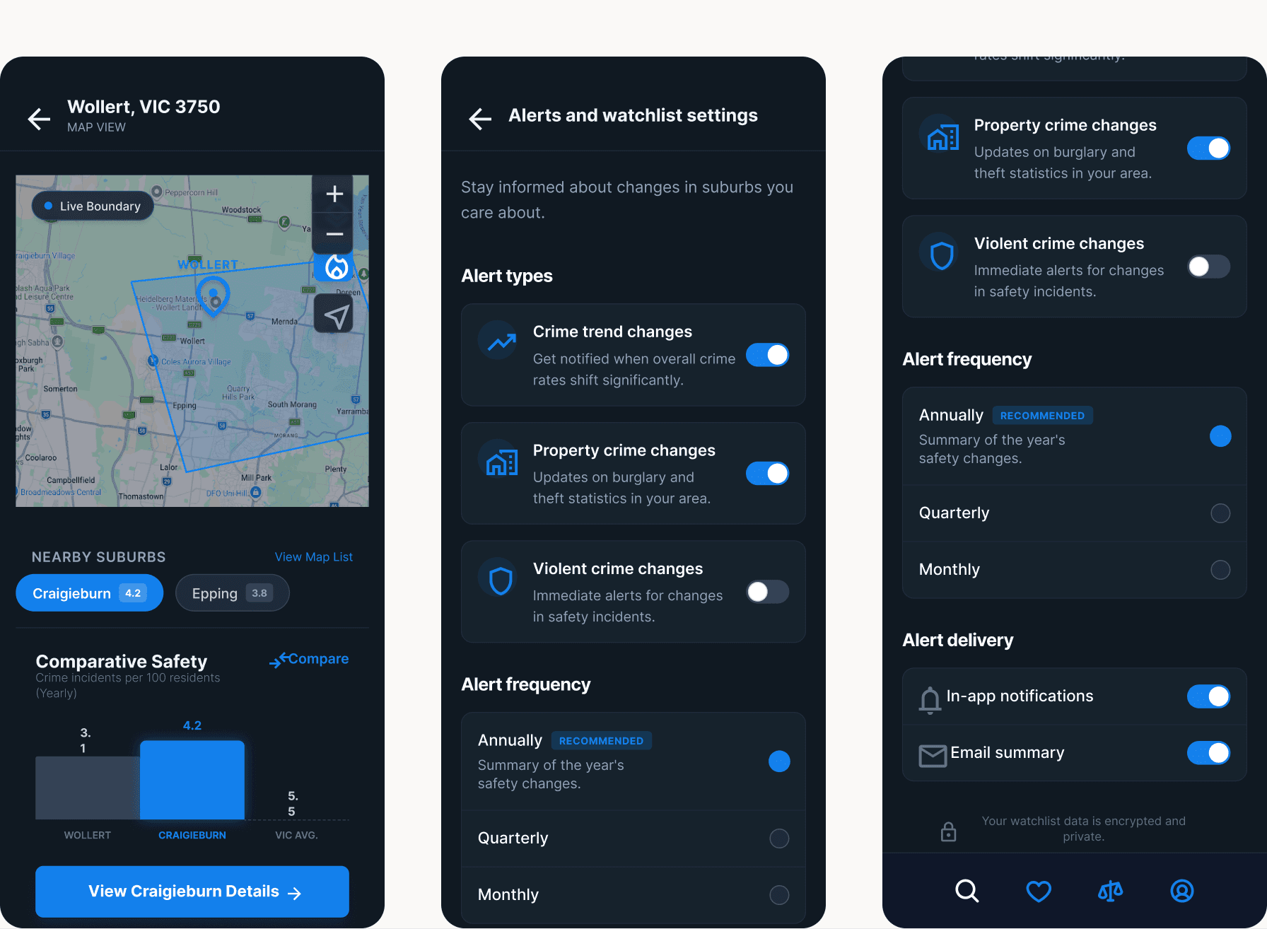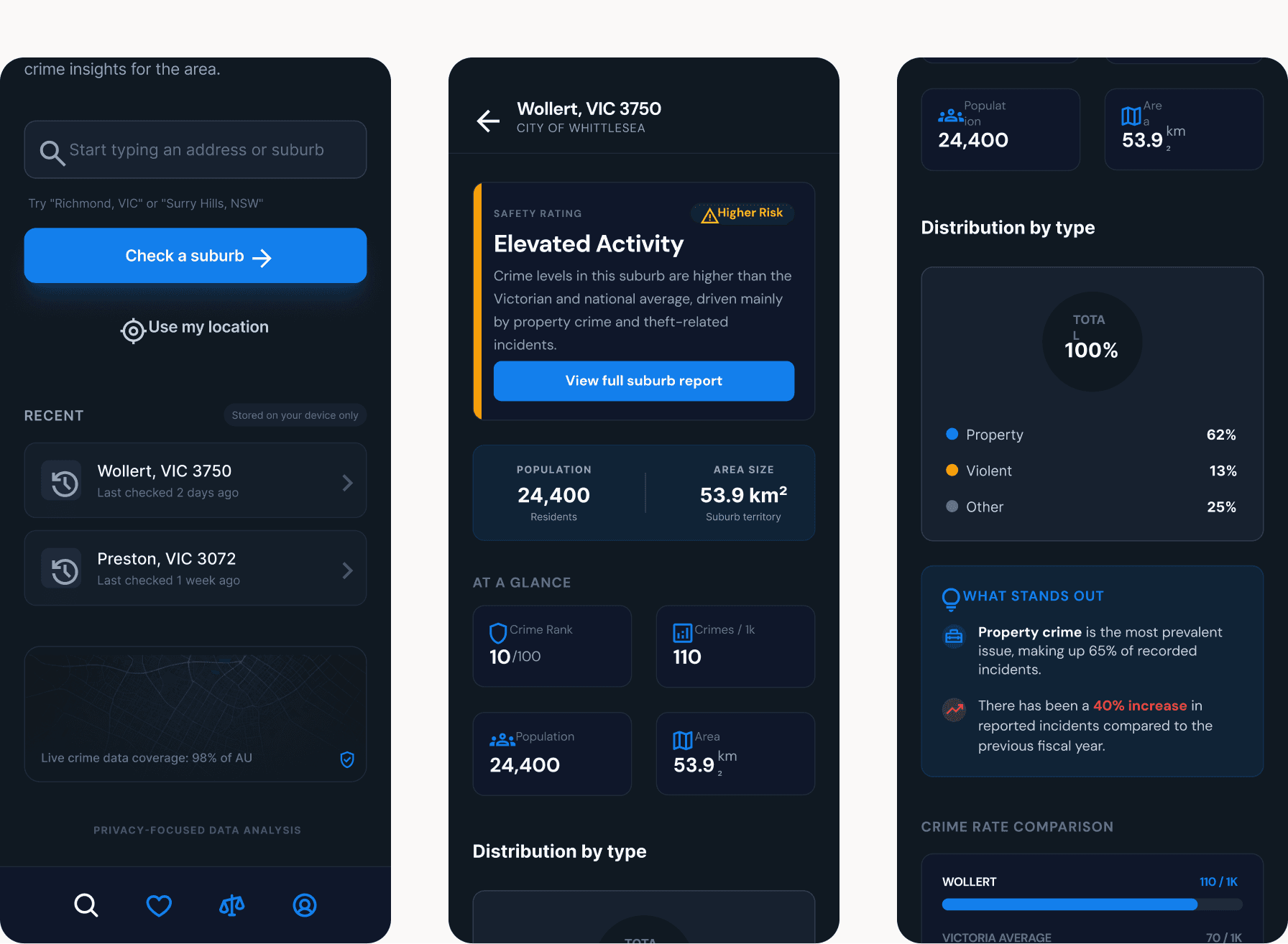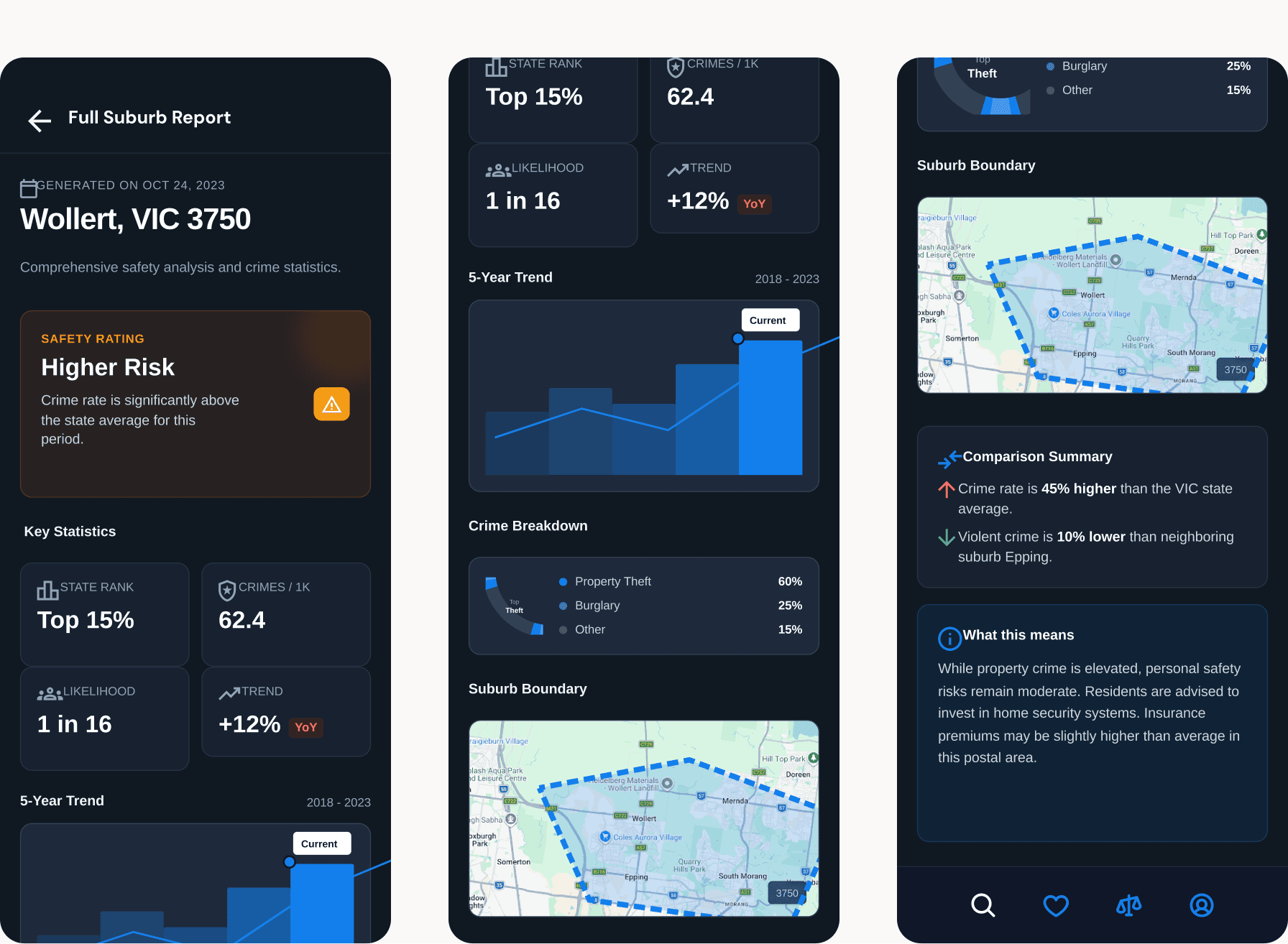 Choosing a suburb is often about trade-offs. We designed a "Compare" tool that allows users to benchmark a suburb like Wollert against state averages or neighbouring areas. This visual benchmarking is essential for a better user experience because it provides the necessary context for the data. Seeing that a suburb's crime rate is "High" compared to the state average, but "Lower" than a nearby alternative, helps the user make a more nuanced and less fearful decision.